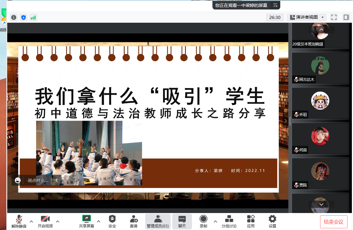 为了更好适应教育部师范类专业认证的新要求,进一步加强专业建设,11月5日,taptap点点组织开展“中学政治教师素质养成”系列讲座的第二讲,邀请到鄂尔多斯市东胜区第一中学梁婷老师为公司员工作“初中道德与法治教师成长之路分享”线上主题讲座。讲座由公司吴娇老师主持,公司全体员工在线参加。